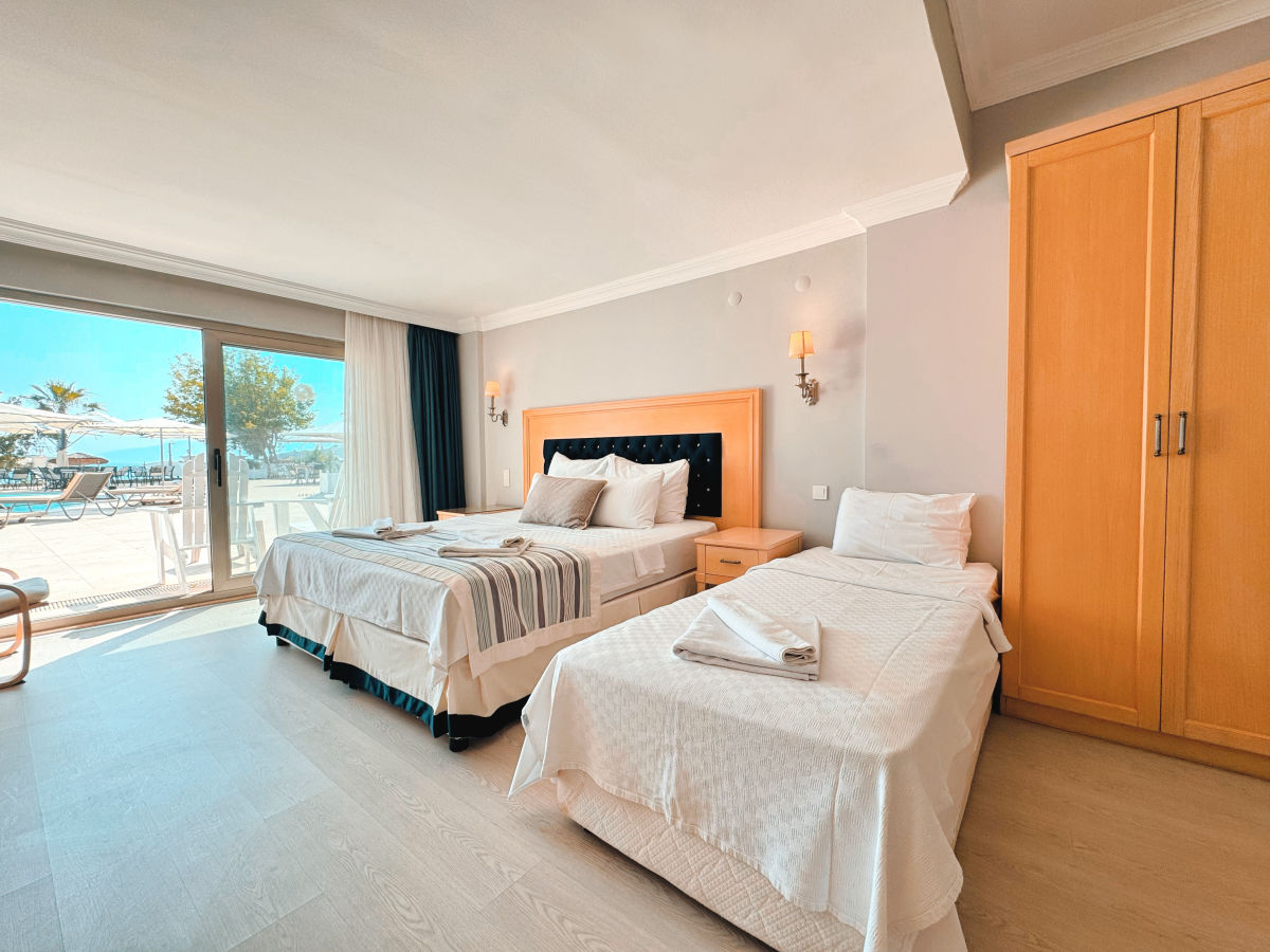 Maksimum oda konaklama kapasitesi 3+1 kişidir. Bu odalar A Blok’ta giriş katındadır. 6 Odamız deniz Manzaralı, 6 odamız da bahçe manzaralıdır. Zemin laminant parke kaplıdır. Odalar balkonludur.